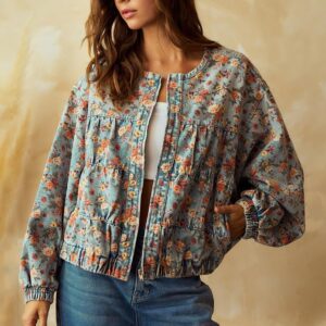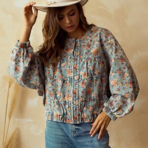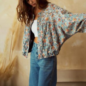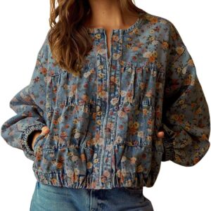 CHOUYATOU Women's Cute Floral Print Denim Bomber Jacket
