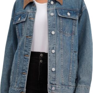 This denim jacket combines classic jean jacket elements with a modern twist, featuring a stylish corduroy collar detail that enhances the overall look.
