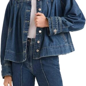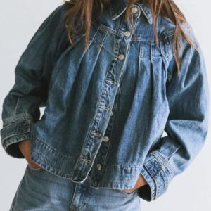 Women Cropped Denim Jacket Long Sleeve Pleated Jean Jacket