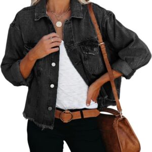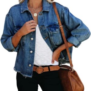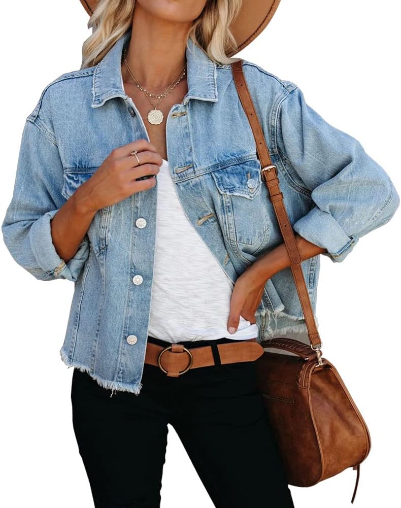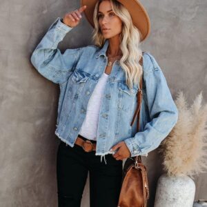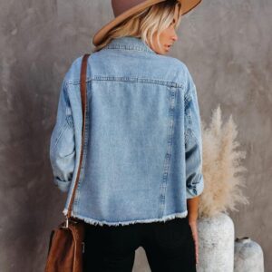 Button Front Raw Hem Crop Trucker Denim Jacket Long Style