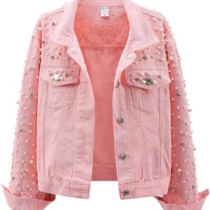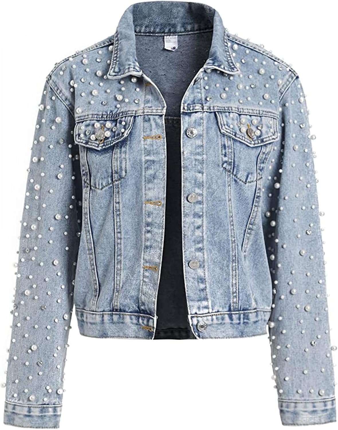 LifeShe Women’s Pearls Denim Jacket Cropped Rhinestones Jean Jacket Coat