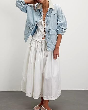 Lumister Women’s Oversized Denim Jacket with Contrast Trim Long Sleeve Button Down Jean Coat with Pockets Outerwear