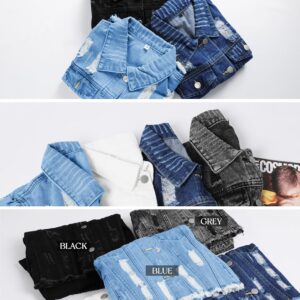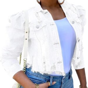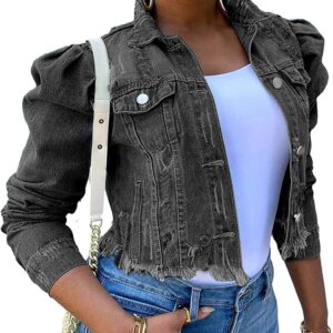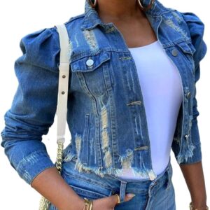 Omoone Women’s Ripped Puff Sleeve Denim Crop Top Long-Sleeve Cropped Jean Jacket