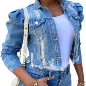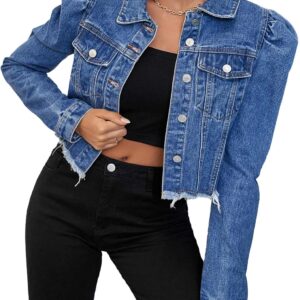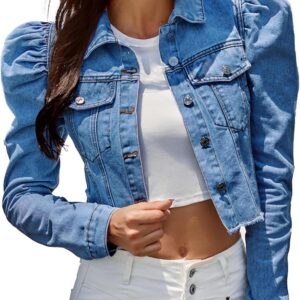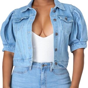 SOMTHRON Women's Cropped Jean Jacket Puff Short Sleeve Button Down Denim Coat Crop Top Outerwear