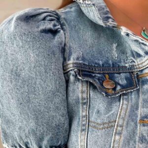 - This denim jean jacket is designed with classic lapel, button up, two fake pockets, puff short sleeve, cropped short length.