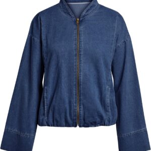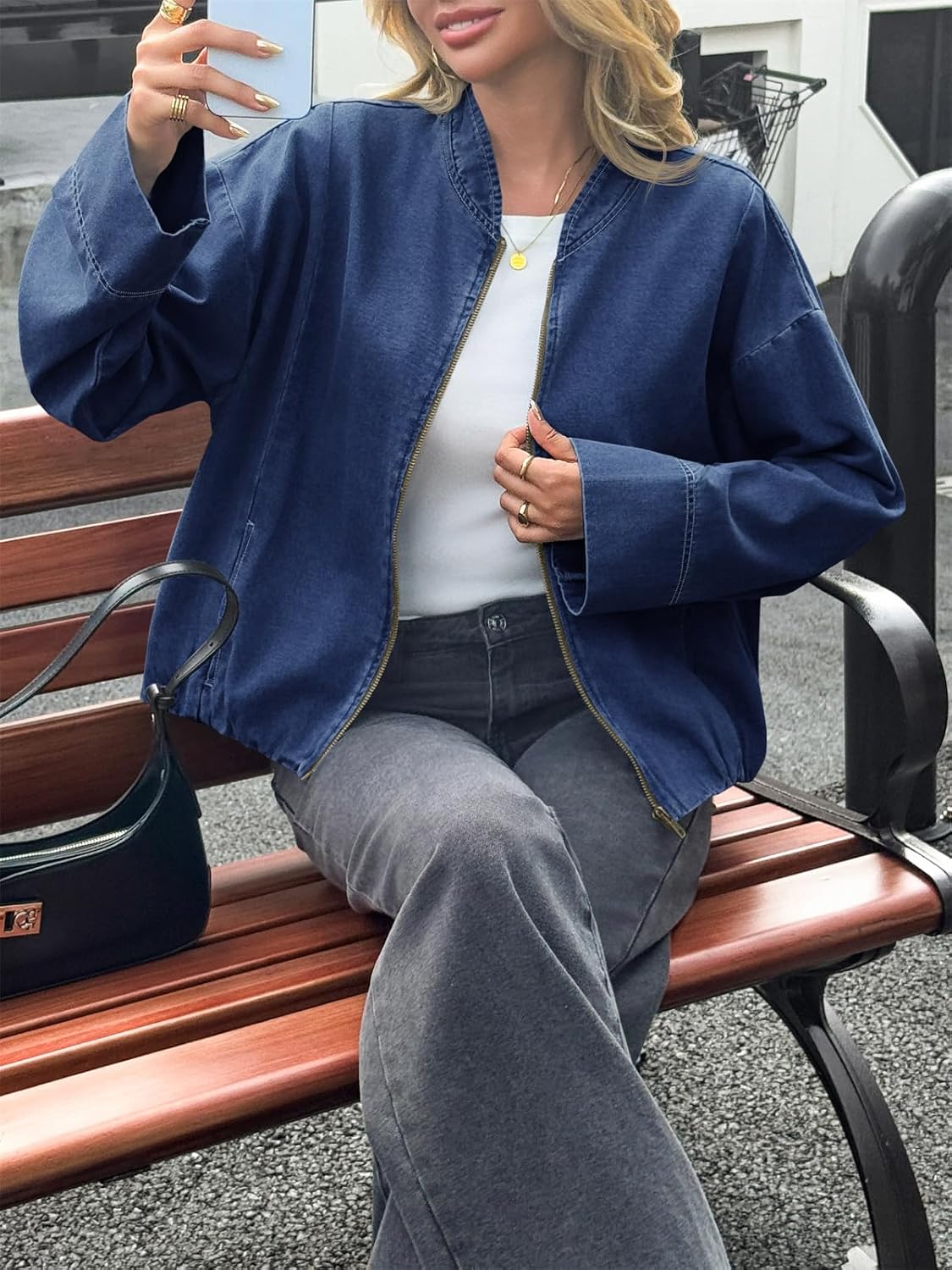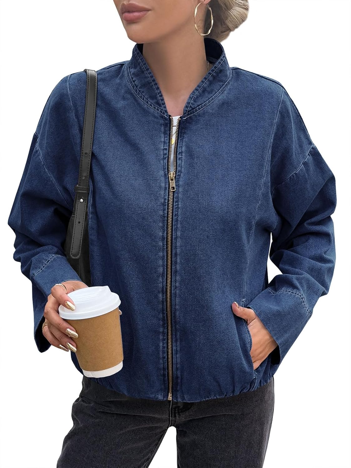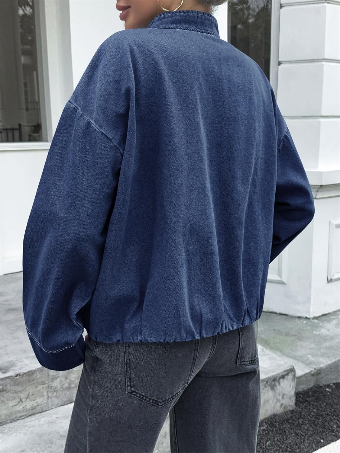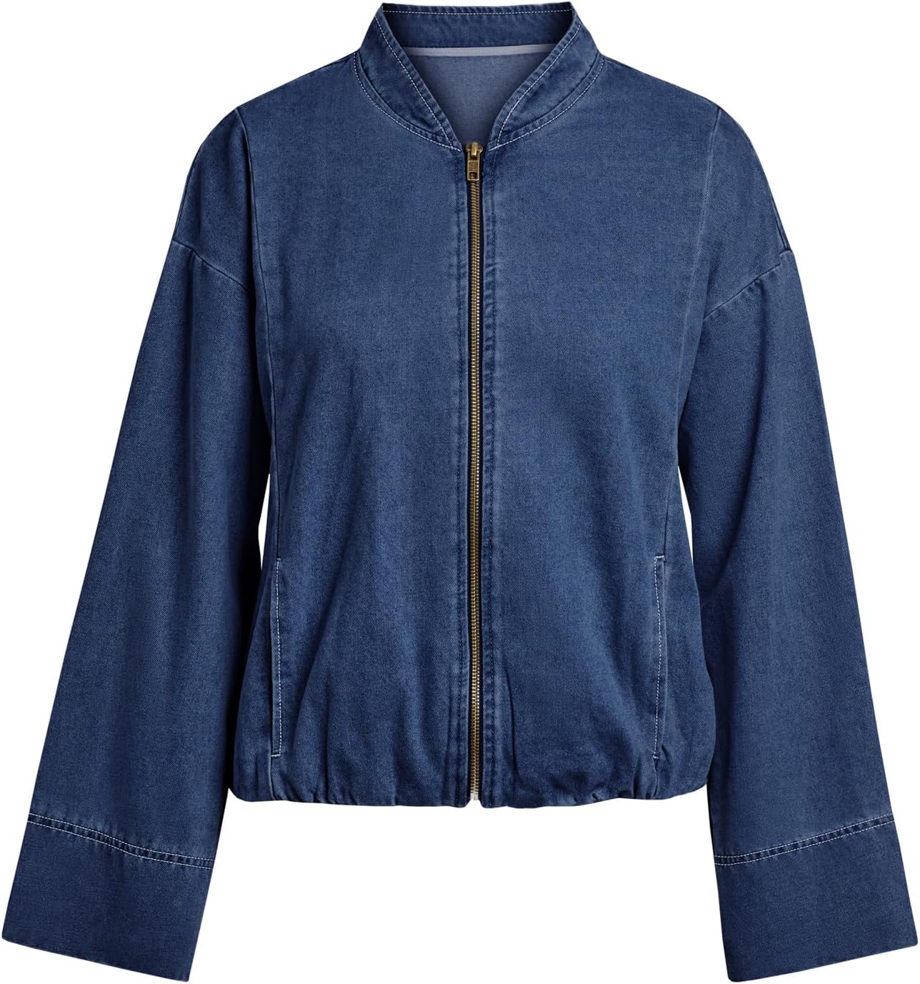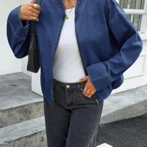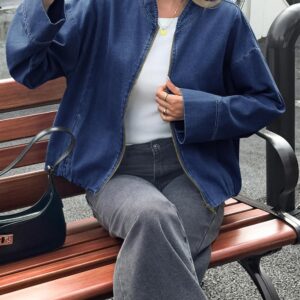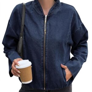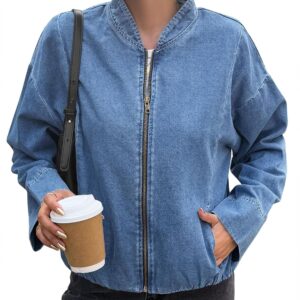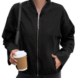 Tankaneo Womens Denim Bomber Jacket Zip Up Cropped Lightweight Jean Jacket Fall Casual Outerwear with Pockets