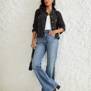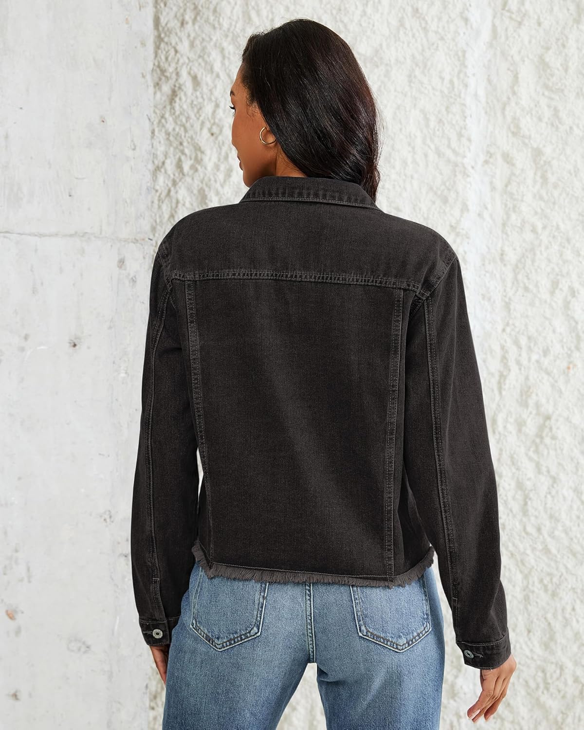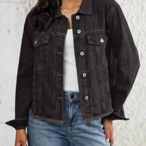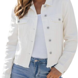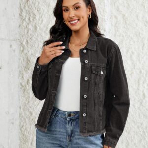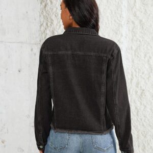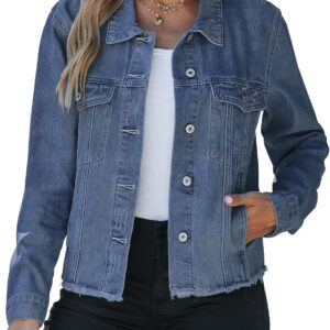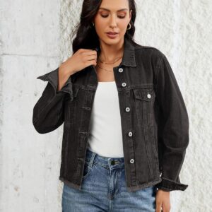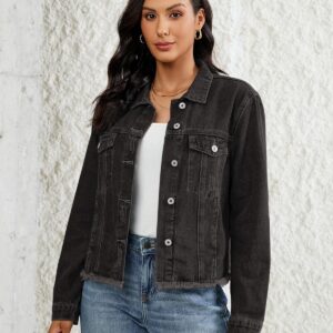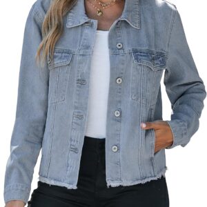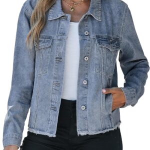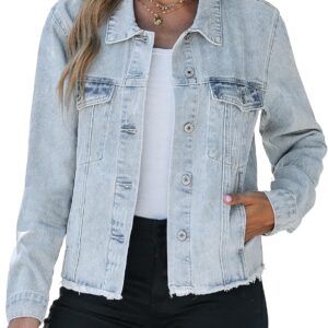 Vetinee Jean Jacket Women Trendy Button Down Long Sleeves Casual Distressed Frayed Hem Trucker Denim Jackets with Pocket